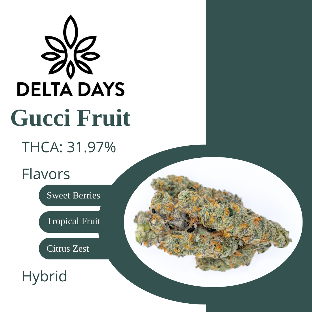 Gucci Fruit is a premium, flavor-packed THCA strain that blends exotic sweetness with smooth, balanced effects. Known for its eye-catching bag appeal and rich terpene profile, this hybrid delivers a refined experience that feels as elevated as its name suggests.